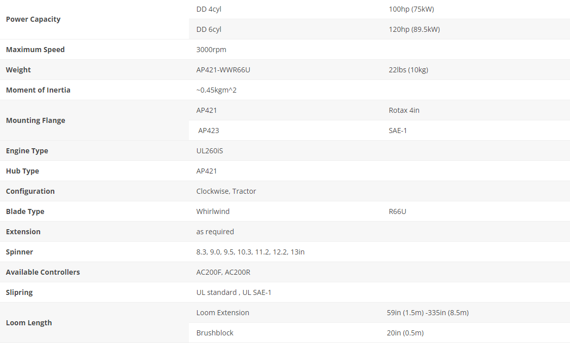 The performance gain from the AP4x constant speed hub, combined with the outstanding design of the Whirlwind U series blade, allows this propeller to perform over a very wide range of speeds.  As such it is an extremely popular model, finding application on a wide range of aircraft.